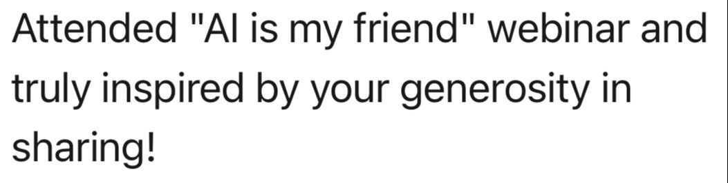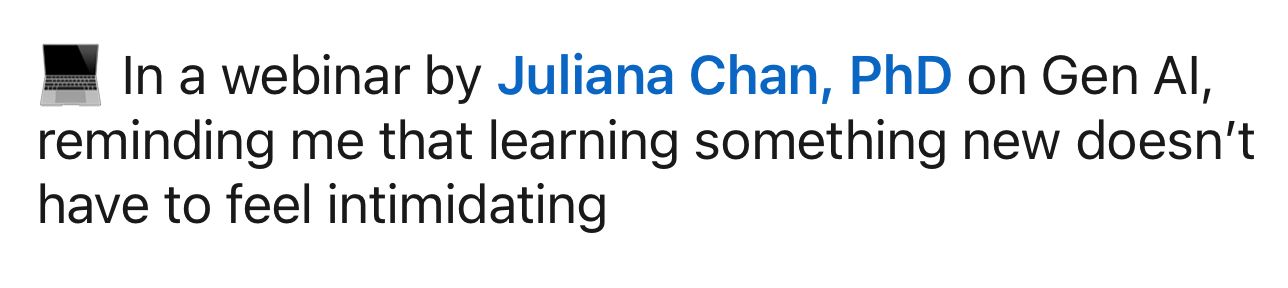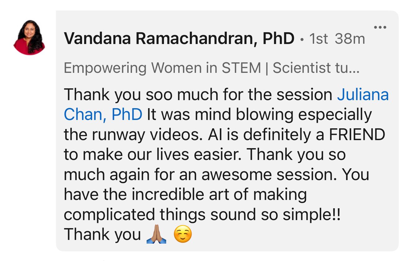 Join your genAI guide Dr. Juliana Chan in this 60-min beginner-level AI IS MY FRIEND: Beginner Generative AI Workshop as we explore how to use generative AI to save time, spark ideas, and make our life a whole lot easier.