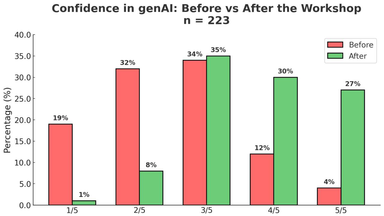 Confidence in genAI at the start versus the end of workshop: